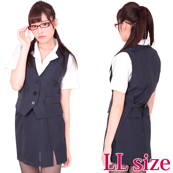 落ち着いた紺色が清楚な秘書の雰囲気を演出!胸元がセクシーな半袖ブラウスとミニスカートに、3つボタンベストのなりきりOLコスプレ3点セットです。