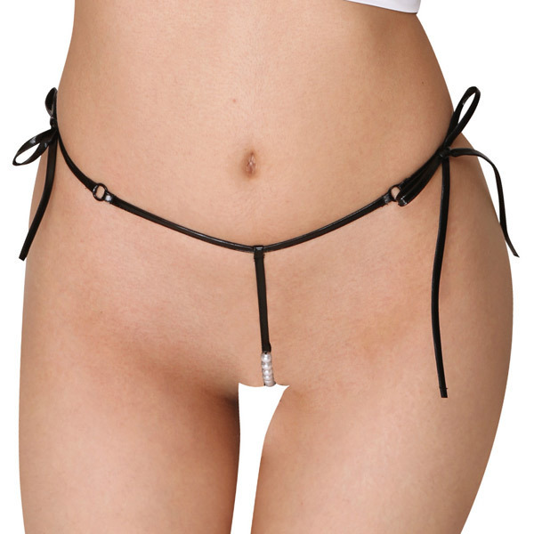 ●漆黒エナメル製の妖艶デザイン●ウエスト両サイドを結ぶ紐パン●紐同士をOリングで連結して固定●クロッチ部分はミニパール仕上げ●バックはGストリング。