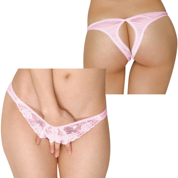 ●ハーフバックデザインショーツ●ピンクレース×光沢フェリカ地●前から後ろまでオープンカット。