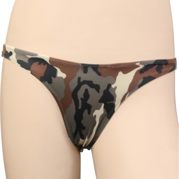 ●ブラウン系のカモフラ柄ショーツ●ストレッチ生地で上下左右に伸縮●ボディにフィットして着心地抜群●セクシーなTバックタイプ●女性用Mサイズ・日本製。