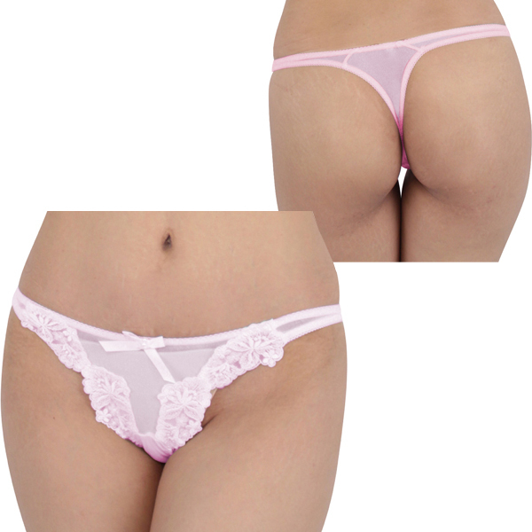 肌触りの良いシースルー生地を花柄の刺繍で飾った日本製Tバック(ピンクカラー)。