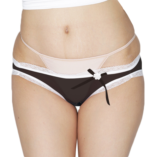 色気たっぷりなシースルー生地のフロントに、白の花飾りをつけたリボンをあしらいフェミニンに仕上げた一枚です♪