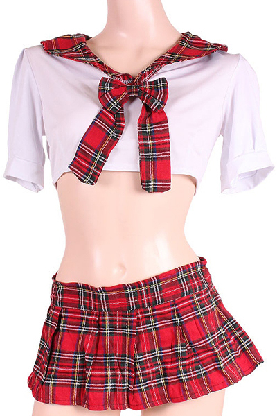 超ミニ丈のプリーツスカートと爽やかな白の半袖トップスを、赤のチェック柄でキュートにデコレーション♪大人の魅力とフェミニンな雰囲気を同時に醸し出す可愛いセーラー服コスプレです。