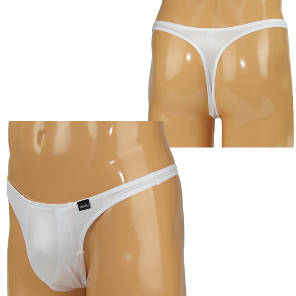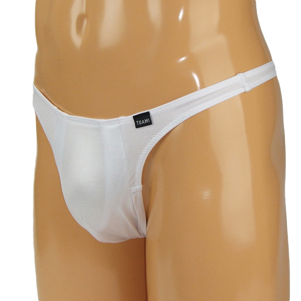 メンズ 光沢ストレッチ生地玉袋付きTバック Mホワイト