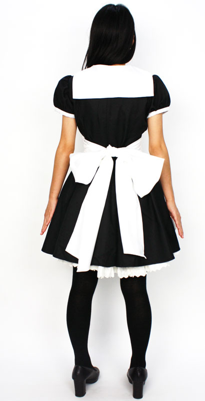 Sサイズ:B72〜80cm・W58〜65cm 丈:ワンピース75cm(袖丈10cm)・ペチコート45cm セット内容:ワンピース(後ろファスナー、袖パフスリーブ、全円スカート、内側に襟固定用のボタン付)・エプロン・ペチコート(裾レース付、ウェストゴム仕様)・カチューシャ・ブローチ(安全ピン付)
