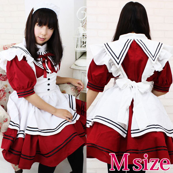 セーラー服を彷彿とさせるエリ付きのメイドコスチューム(エンジ)。
