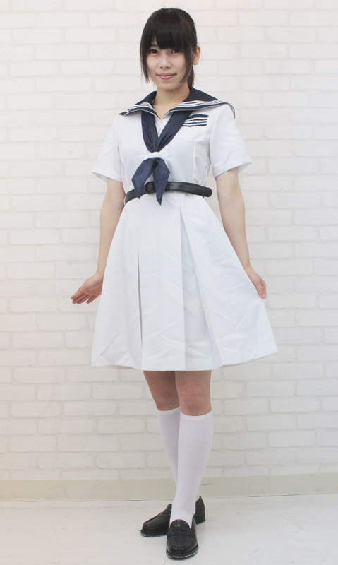 ちょっぴり長め丈の夏服ワンピースが清楚な印象!ベルトでウエストマークされるので脚長効果も抜群!もちろん紺色のスカーフもセットです。
