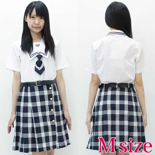 ボックスプリーツに4つの金ボタンがポイント!ミニネクタイが可愛い半袖トップスと、ベルト付き巻きスカートがセクシーな学園風の制服コスチュームです。