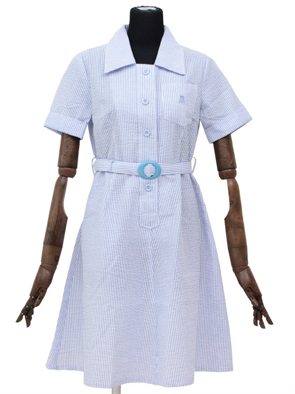 水色×白の細ストライプ柄が好印象!涼しげで爽やかなワンピースタイプの制服コスプレ。