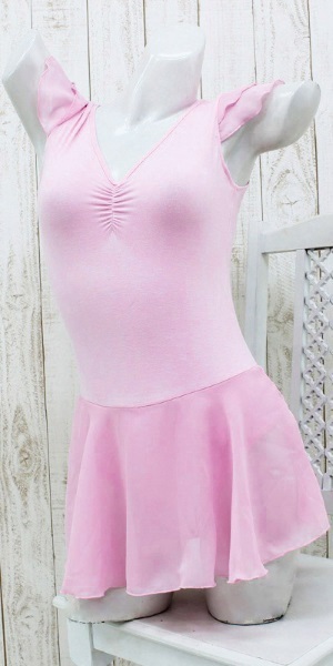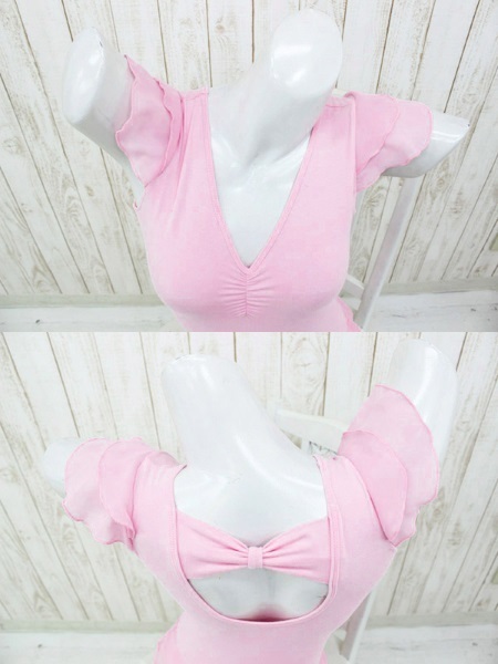 ●ふんわり女性らしいパステルピンク●本格的な雰囲気のバレエレオタード●二段フリル付きのひらひらスリーブ●デコルテが綺麗に映えるVネック●胸元に優しく寄り添うギャザー入り●大きく開いた背中にリボン飾り付き●花びらのように広がるミニスカート●裏地には一部当て布付き。