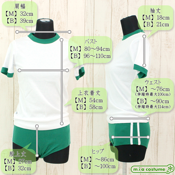 BIGサイズ B96〜110cm・W〜90cm(伸縮時最大114cm)・H〜100cm 上衣:着丈58cm・肩幅39cm・袖丈21cm ブルマ:股上丈32cm セット内容:上衣、ブルマ 素材:ポリエステル65%、コットン35%