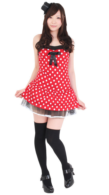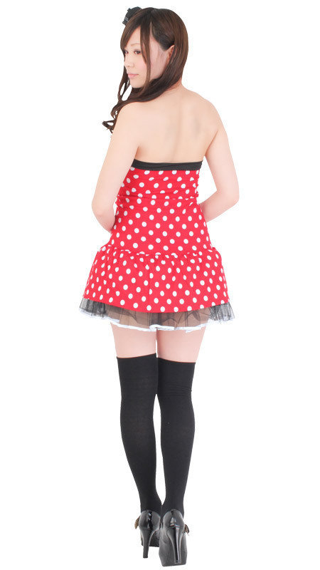 赤地に白のドット柄がとっても可愛いミニーチューブトップ!セクシーな肩出しワンピースの胸中央にある黒いリボンが、さらに可愛さを引き立たせます!スカート部分は女の子らしいチュール素材でふんわりと仕上げたコスチュームです。