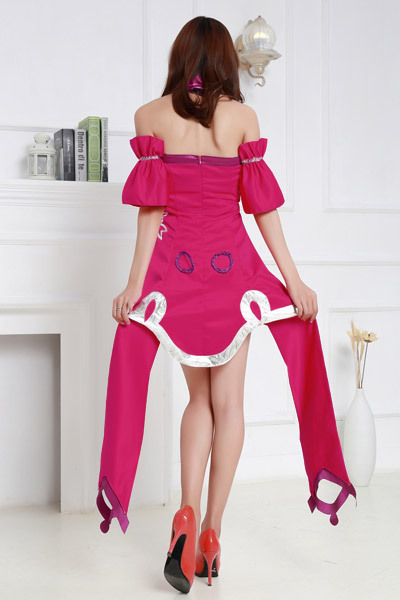 オフショルとバックレスのコンボ技で大胆かつとってもセクシー♪ビビッドなピンクカラー、デザインともに目を引く衣装となっています。