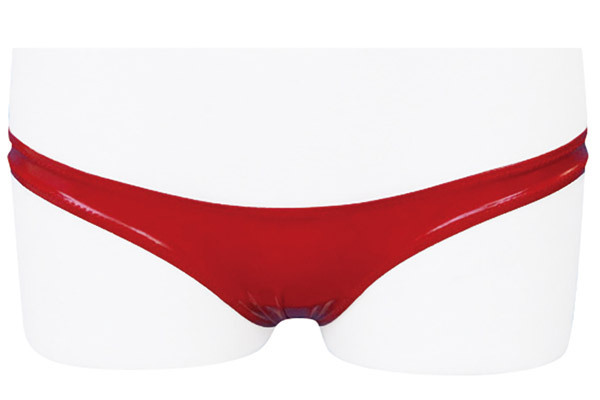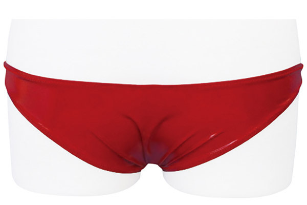 際どいラインで魅了するエナメル調のローライズビキニ(赤)。